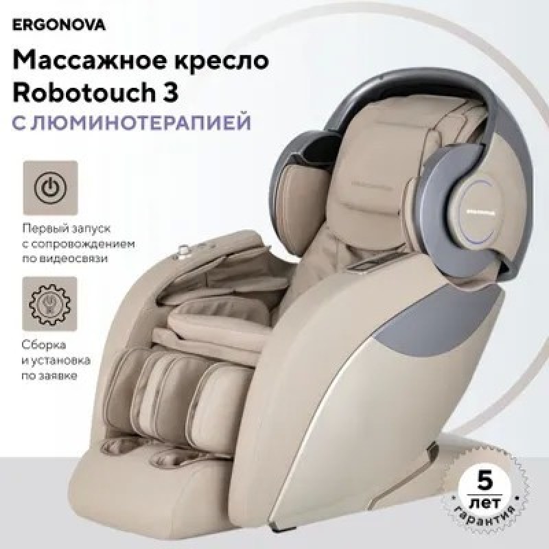 Массажное кресло Ergonova Robotouch 3 High-End в мире антистресс систем! Первое в мире кресло с люминотерапией и ароматерапией!Уникальная технология - Выдвижной купол. Запатентованная технология выдвижного купола создана для полноценного создания вашей лаунж зоны. Эта функция «запатентована» и позволяет превратить из просто массажного кресла в полноценную лаунж-зону.4D Robotouch System. Новая технология 4D Robotouch System — это уникальное трехмерное движение роликов, которое не похоже ни на одно другое кресло на рынке. Массажные ролики следуют S-образной траектории, которая имитирует естественную кривизну позвоночника. Конструкция S-Track гарантирует, что массажные ролики могут достигать каждой части вашего позвоночника, прямо от основания головы до копчика, чтобы дать вам ощущение массажа всего тела, которое зарядит энергией и стимулирует мышцы.Уникальная растяжка 2-way stretch technology 3. Скручивание корпуса с твист-растяжкой, которая позволяет сделать талию стройной, а фигуру выразительной.Воздушно-компрессионный массаж. 72 воздушные подушки расположены так, чтобы не оставить ни один участок тела без внимания. Подушечки мягко, но настойчиво воздействуют на различные зоны тела, запуская оздоровительные процессы в организме.Массаж стоп на 360 градусов. Круговой прогрев стоп с поддержкой технологии 360° warm foot massage обеспечивает ускорение кровотока и усиливает расслабляющий эффект от массажа. Две пары роликов массируют стопы, шарики массируют пятки, а подушки отвечают за компрессионный массаж. Система автоматического определения длины стопы позволяет достигнуть самых комфортных ощущений во время массажа.Антистресс-технология люминотерапии. Инновационная технология в мире массажных кресел. Фототерапия с подсветкой синего цвета погрузит ваше тело в режим релаксации, поможет синхронизироваться с его биологическими ритмами и улучшить качество сна.6 программ автоматического массажа: Активный Шуцзин (Shujing Active)/ Растяжка спины (Back Stretching)/ Спокойной ночи (Sleeping Massage)/ Дыхательный массаж (Breathing)/ Шея и плечи (Neck and Shoulder)/ Красивые ягодицы (Beautiful Butt Shaped).Дополнительные программы: Джакузи (Blu-ray bath)/ Музыкальное спа (Music SPA)/ Ароматерапия (Fragrant health).Инфракрасный подогрев спины и икр для еще большего расслабления. С подогревом массаж станет эффективней и приятней. А в холодное время года эта функция станет приятным бонусом. В качестве источника инфракрасного излучения применяется углеродное волокно - ценный материал с дорогостоящими компонентами и уникальными свойствами.2 положения невесомости. Благодаря функции Zero G одним нажатием кнопки вы перейдете в положение невесомости - лучшее положение для расслабления организма. Ноги находятся чуть выше головы, и нагрузка на позвоночник распределяется равномерно.Новый уровень ощущений с ароматерапией. В Ergonova RoboTouch 3 Universe есть специальный блок для аромамасел, благодаря которому вы сможете испытать еще больше удовольствия и улучшить свое состояние. Ароматерапия помогает справиться с головными болями и депрессией, вернуть уверенность в себе и улучшить настроение.Ощутите космическое удовольствие с Ergonova RoboTouch 3!*Вес кресла: 168 кг. Габариты (ГхШхВ): 184x80х137 см. Габариты в разложенном состоянии (Zero-G): 220x80х137 см.Ширина дверного проема - 81 см.**Доставку и сборку осуществляет компания Ergonova.