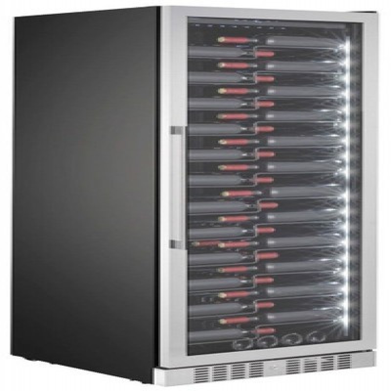 Общие данные:Размеры:высота: 183,5  смширина: 65,5 смглубина: 68 смОбъем: 490 лМаксимальное количество бутылок: 143Тип управления: электронныйКлиматический класс: N (от +16°C до +32°C)Класс энергопотребления: FГодовое энергопотребление (кВт*ч): 128Цвет корпуса: ЧёрныйЦвет дверцы: Нержавеющая стальКоличество температурных зон: 1Диапазон температур: 5-20°СТип системы охлаждения: компрессорныйВинное отделение:Полки: 12Подсветка (белая)Винный шкаф оборудован вентиляторами, которые обеспечивают циркуляцию воздуха. Конденсат в винном шкафу используется повторно и, таким образом, поддерживает оптимальную влажность, а фильтр с активированным углем обеспечивает свежий и чистый воздух в холодильнике для вина.Дополнительная информация:Винный шкаф оборудован специальными полками,  которые элегантно демонстрируют винные бутылки и этикетки вашей коллекции.Стеклопакет дверцы заполнен аргоном, что существенно снижает теплопотери, а УФ-фильтр защищает вино от вредных ультрафиолетовых лучей, которые могут проникнуть внутрь холодильника.Светодиодная подсветка находится сбоку для лучшей подсветки этикеток.Об охлаждении винного шкафа заботится тихий компрессор с низким уровнем шума и меньшим потреблением электроэнергии. Компрессор не только бесшумный, но и опирается на наши специально разработанные ножки, которые защищают вино от вредных вибраций.Замок двериХладагент: R600a Уровень шума (дБ): 40